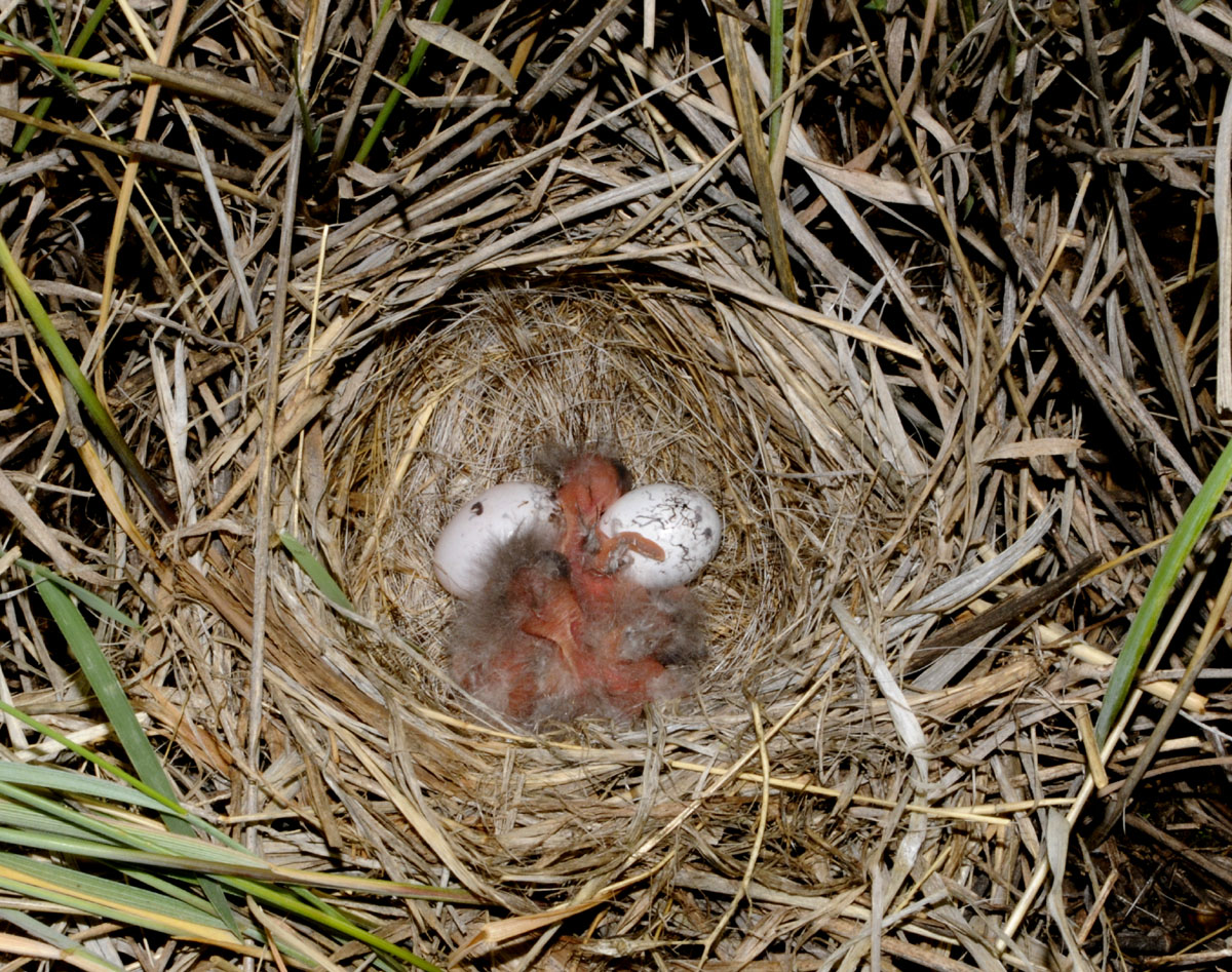 There are at least two recently hatched chicks in the nest. The two eggs are probably going to hatch over the following two days. The chicks could raise their heads and open their beaks for food, but this wasn't photographed.