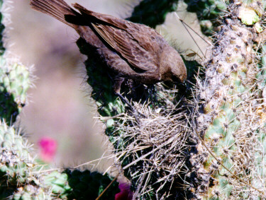 The nest shown in these photographs was found by George Hentz during Arizona Breeding Bird Atlas work in south-central Arizona. Because of the paucity of nest photographs for this species, we looked at George's discovery as a great opportunity to document the nest construction and cactus preference so it could be used to help us find other nests. Earle volunteered to photograph the nest using a remote camera trigger so the birds would not be disturbed. This technique works well because a person is not near the nest and the adult that comes to the nest will soon ignore the camera that is a short distance away. Earle waited for an adult to visit the nest and took the photograph shown below.