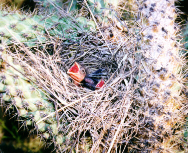 Look carefully at the bird standing on the edge of the nest. Compare this bird with the photograph on the previous page. Once you do the comparison it should be apparent that the bird at the nest is not a Rufous-wing Sparrow. In the nest are the baby birds shown above. This bird is looking in the nest and it can see the baby birds present. What is this bird and what is it doing?