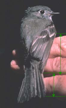 One of the ways to tell Hammonds and Dusky flycatchers apart is to look at the relative lengths of the primary (wing) feathers and the retrices (tail feathers). In the field, consider the length of the observed primary and then compare it to the observed length of the tail as it extends beyond the wing tip. If you can imagine the primary as being about twice as long as the tail, you are looking at a Hammonds. Or, the Hammonds tail extension is "Half" the primary, which is easier to remember. If the wing and tail lengths are about the same, you are looking at a Dusky.